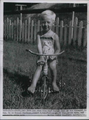 1955 Press Photo Cute Blonde Kidnapped Boy Toddler Ronnie Wietkamp On Bicycle