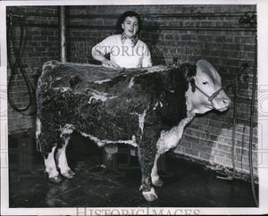 1950 Press Photo Beverly Watts clean her Hereford Calf for Intl. Livestock Show.