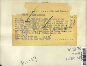At the International Live Stock exposition in Chicago. l to r; Dorcas Wilson, Loretta Miller, Anna Rosemeyer and Zeonna Drake.