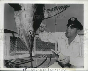 1941 Press Photo Balboa, Calif Thomas Boughley & a swordfish caught by L Tarr
