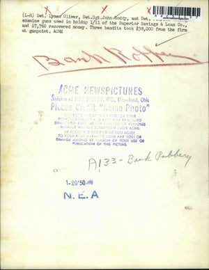 1950 Press Photo Det. Lymen Oliver, Det Sgt. John Roddy examines guns in hold up