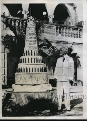 1933 Press Photo Col. Henry L. Doherty Stands by Huge Cake for Pres. Roosevelt