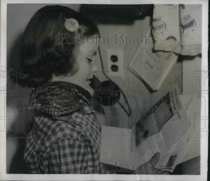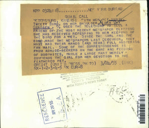 With her pet quail, Tweety Bird, on her shoulder, Lora May Gerdsen, 9, used the telephone to tell a friend of the most recent newspaper clipping she has received referring to her keeping of the bird for a pet.