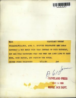 1953 Press Photo Mrs. Anna Dryfuse Celebrates 102nd Birthday