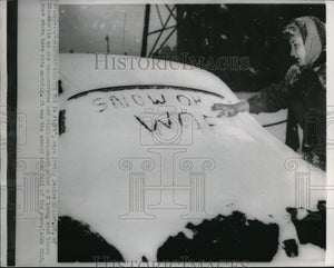 1951 Press Photo Janice Miller writing on car after a Minneapolis snow storm