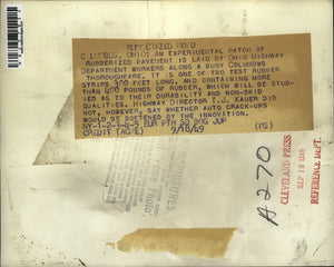 Laid by Ohio Highway Department workers along a busy Columbus thoroughfare. It is one of two test rubber strips 300ft. long and containing more than 400 lbs. of rubber which will be studied as to their durability and non-skid qualities.