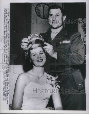 1953 Press Photo Marine Lt Jim Collum crowns Carol Seiss as Big Game Queen