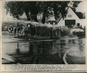 1947 Press Photo Police use fire hose to destroy pickets at Remington-Rand plant