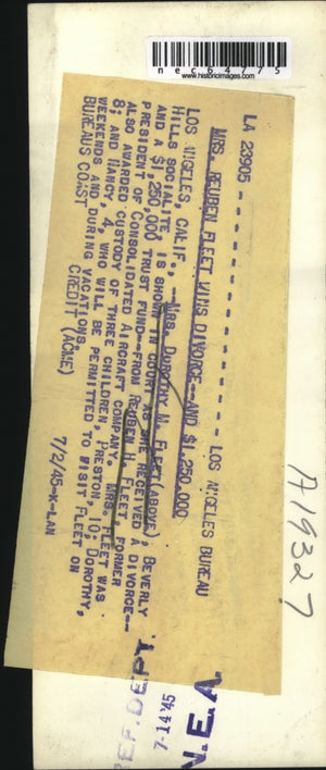 1945 Press Photo Dorothy Fleet divorces Reuben Fleet of Consolidated Aircraft Co