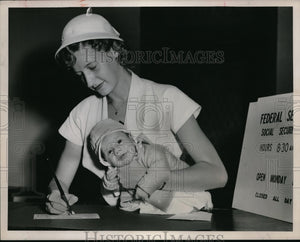 1951 Press Photo Mrs. Robert Engelking And Baby Sign Up For Social Security Card