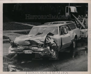 Press Photo Wrecked car behind a tow truck at accident scene - nec67103
