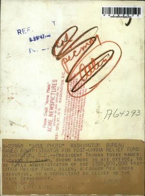 1947 Press Photo Post UNRRA Relief Fund admin Richard Allen in DC