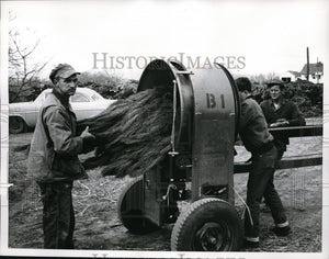 1962 Press Photo Workers Unfold Christmas Tree Branches With Machine