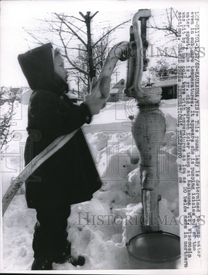 1962 Press Photo 3 yr old Maureen Esler tries to use frozen pump - nec69967