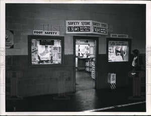 1954 Press Photo Safety store front display with eye & foot protective gear