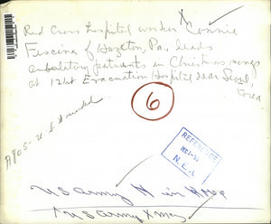 Red Cross hospital worker Connie Fiscina leads ambulatory patients in Christmas Party song at 121st Evacuation Hospital near Seoul.