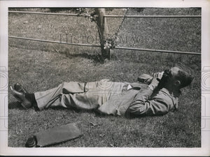 1937 Press Photo Man lays in the grass to take a photograph - nec71382