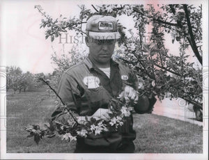 Press Photo Dick West with blooming trees at West Orchards in Cleveland