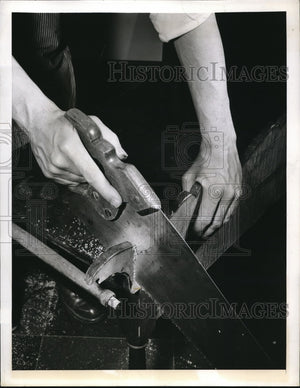 1943 Press Photo Mr Hunt doing carpentry work with his saw