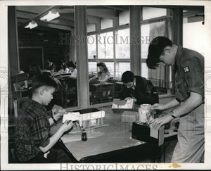 1944 Press Photo Students in a divided scholl classroom study & work projects