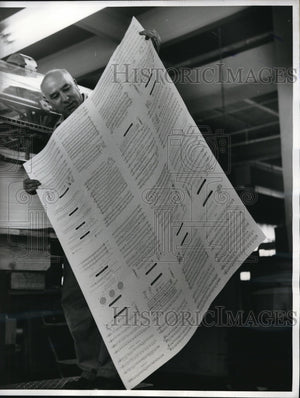 1960 Press Photo pressman Arthur Tosques checks music sheet fresh off the press