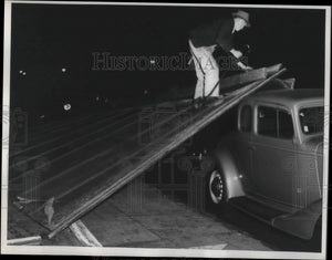 1943 Press Photo Signboard fell on his automobile after 50-mile-an-hour blew out
