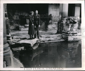 1949 Press Photo Sightseers stand on the ancient diving stone Great Roman Bath