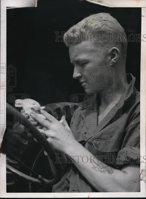1950 Press Photo 25th Div. jeep driver Cpl. Andrew Slayer & pet rabbit, Doretta,
