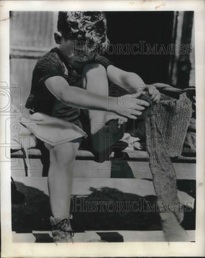 1945 Press Photo Little Daniel Soudey of Rouen France tries pair of woolen socks