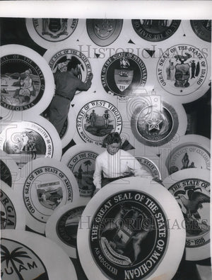 1957 Press Photo DC Mrs Gunther Kilsheimer & official state seals
