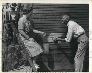 Miss Margaret Johnson, registrar of School of Applied Sciences and President Winfred G. Leutner of Western Reserve University painting a building