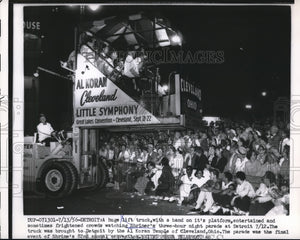 1956 Press Photo A lift truck in Detroit parading down the street with a band