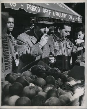 1959 Press Photo Advantage of a pushcart as demonstrated by actor David Wayne