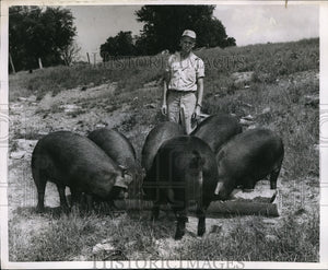 1955 Press Photo Joe Moore feeds his Duroc Jersey Hogs