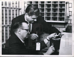 1963 Press Photo Sheriff McGettrich and Rocevar check weapons smuggled at jail
