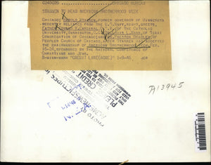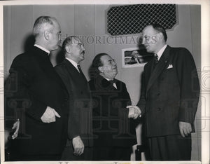 greets Father Edward V Cardinal, Dr Louis l Mann, Dr Preston Bradley after Stassen accepted Chairmanship of American Brotherhood Week Sponsored by National COnference of Christians and Jews