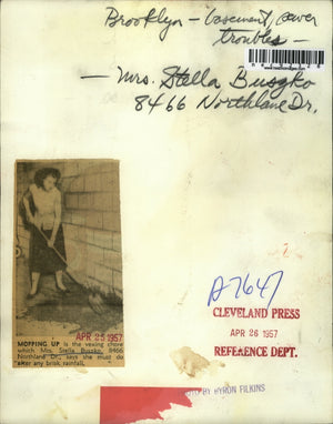 1957 Press Photo Mrs Stella Buszko Mops After Rain Due to Sewer Problem