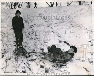 1956 Press Photo Larry Lee, Doug Mulholland sledding in Cain Park, OH