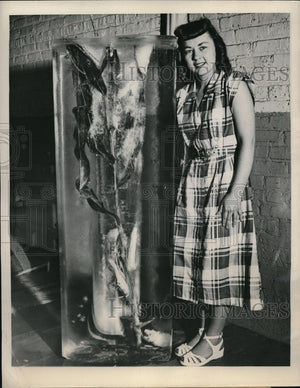 1948 Press Photo Cathy Gregorich with ice frozen around ears of corn.
