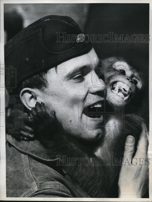1960 Press Photo Helmuth Pilter smiles with Oscar the monkey - nec97140