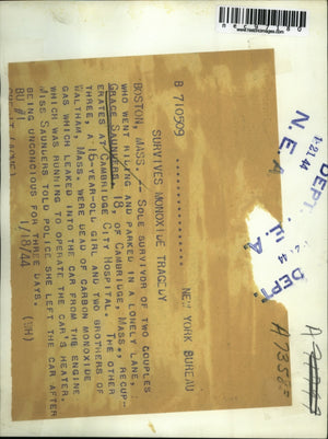 1944 Press Photo Grace Saunuers survives monoxide tragedy in Boston