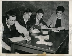 Allentown, Pennsylvania - In the first area in which the government is taking men out of non-essential industries and forcing them to work in war plants, four workers sign up for the vital war work. left to right are Patrick Lettier, Allentown, Pennsylvania, Charles O'Connell, Allentown, Pennsylvania; George Solomon, Allentown, Pennsylvania; and Garfield Rommel, Chataqua, Pennsylvania. All these men were formerly employed in a brewery.