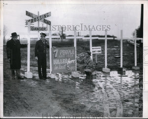 1955 Press Photo RR crossing at Crown Point Ind & sign tells of 7 killed there