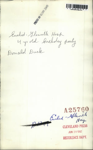 1962 Press Photo Donald Duck at 4 Year Old Birthday Party Euclid Glenville Hosp