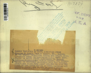 William Lewis, Banker on stand, testifying before the Senate Civil Liberties probe in Washington D.C. Seated in the background is Sheriff Theodore Middleton.