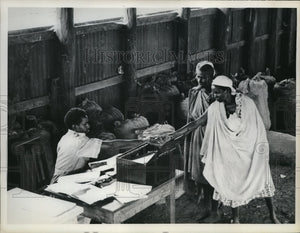 1962 Press Photo Two Kikuyu Villagers paying their fines to a Kenya official.