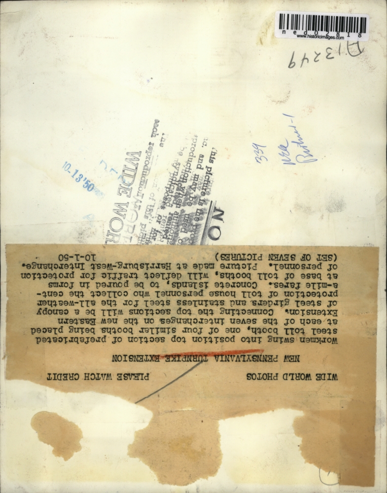 Workmen put the top section of prefabricated steel toll booth, one of four similar booths being placed at each of the seven interchanged on the new Eastern Extension on the New Pennsylvania Turnpike Extension.