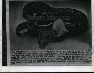 1956 Press Photo White mouse enjoys with boa constrictor Conga as she sheds skin