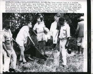 The workers are gathered around looking in the grave of one of the several bodies hastily buried during the battle between U.N. and Katanga forces. One of the bodies identified as Italian Gianni Mino.