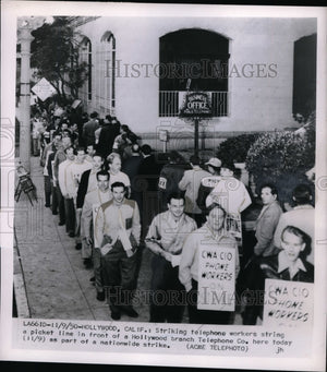 Striking telephone workers in front of Hollywood branch Telephone Co. in California.